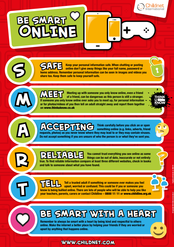 In school we follow these simple tips to stay safe: being 'SMART with a Heart' promoting being respectful whilst online.  The pupils consider how to ACT SMART (with the ACT forming part of our acceptable use policy online).